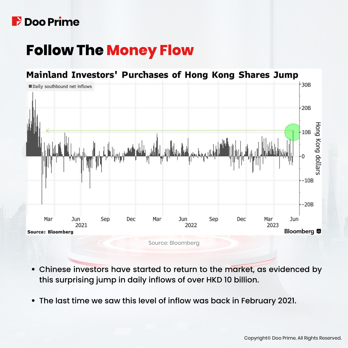 - Chinese investors have started to return to the market, as evidenced by this surprising jump in daily inflows of over HKD 10 billion.