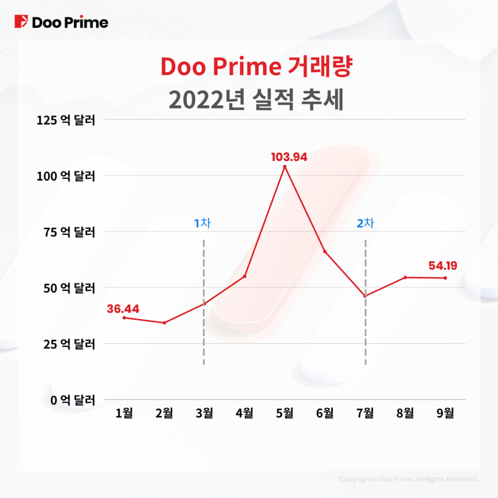 연초부터 지금까지 글로벌 시장이 요동치고 있지만 Doo Prime의 거래량은 꾸준히 늘고 있습니다. 아래 이미지에서 보는 바와 같이 첫 무이자 이벤트가 시작된 이후 거래량이 크게 증가하였습니다. 지난 5월에는 더 급격히 증가했습니다.