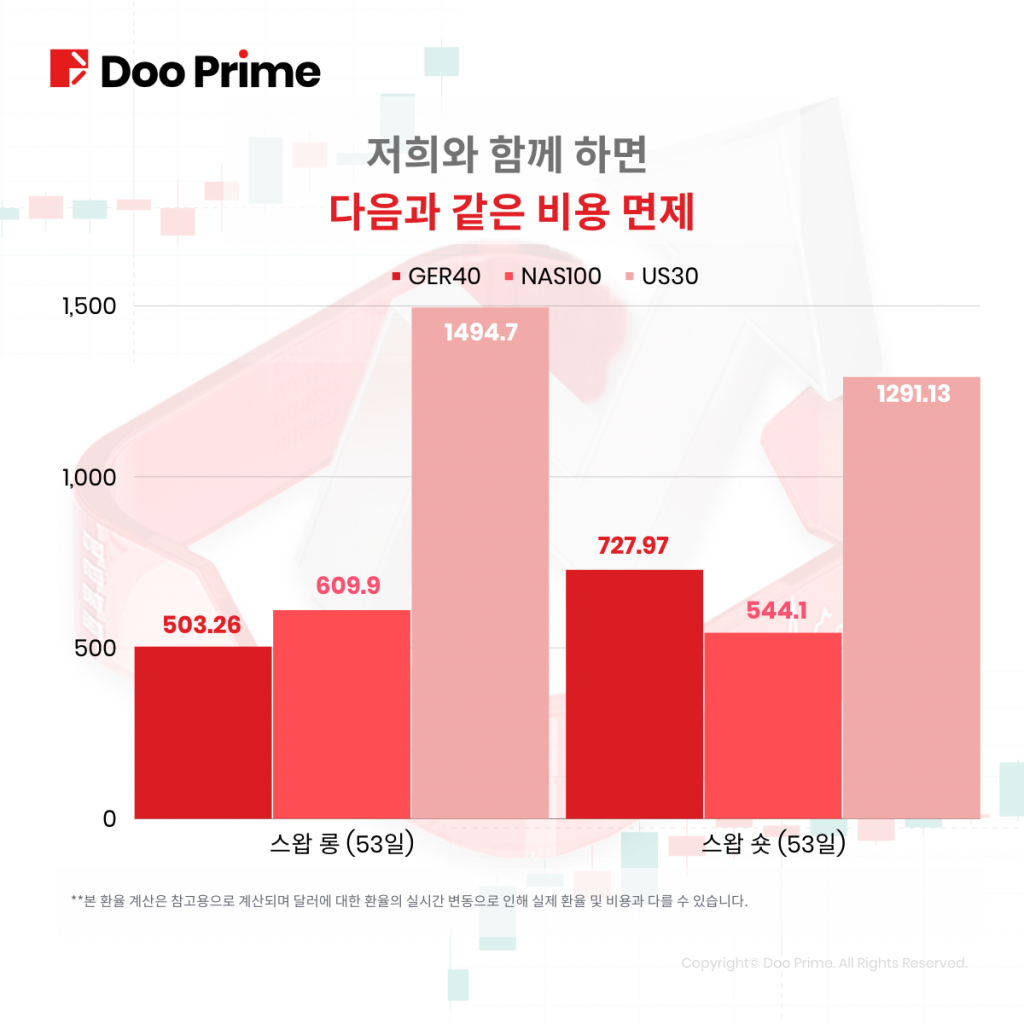 즉 청산이 이루어지기 전까지 보유중인 대부분의 포지션은 매일 롤오버 이자를 차감합니다. 하지만 제2분기에 특별 기획한 Doo Prime 이자 면제 이벤트를 통해 일부 종목의 롤오버 이자를 면제하여 고객님들의 부담을 덜어주고 더 낮은 비용으로 거래를 진행할 수 있게 되었습니다.