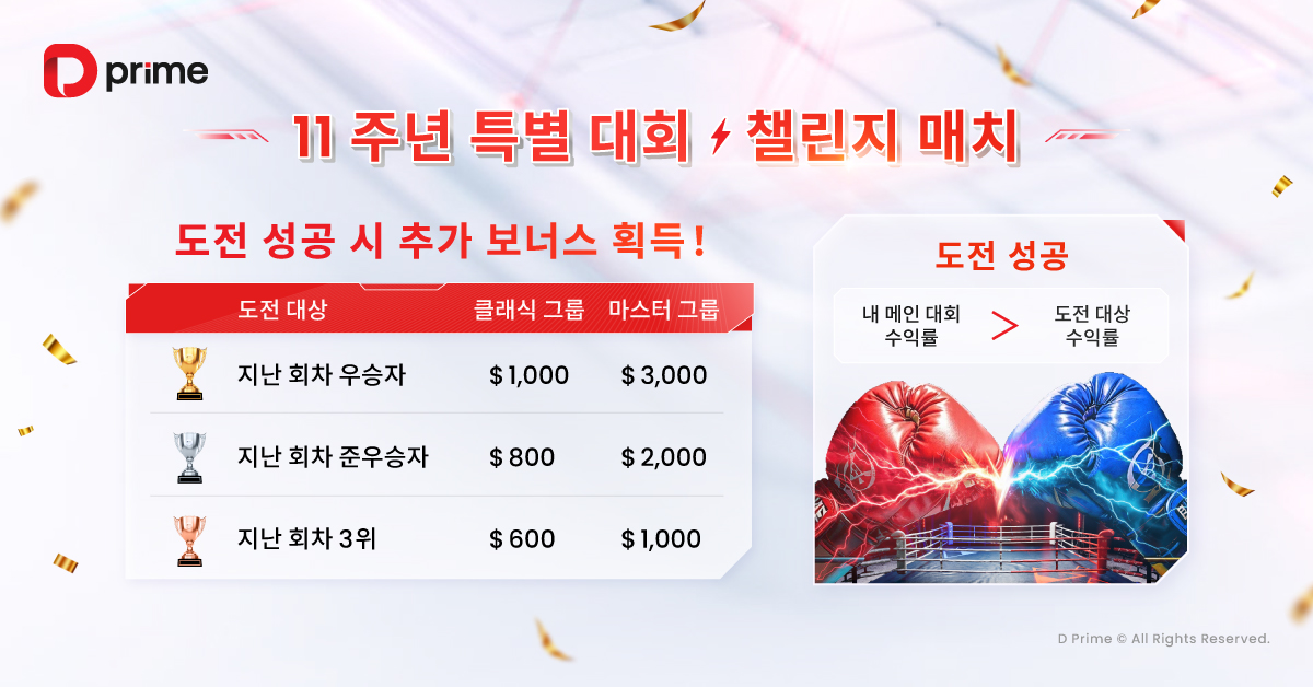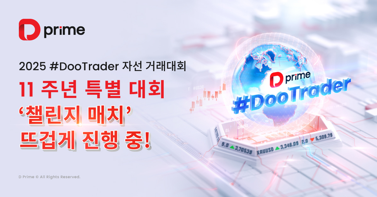 D Prime이 11주년을 맞이하여 #DooTrader 자선 트레이딩 특별 대회 ‘챌린지 매치’가 정식으로 공개됩니다! 이번 이벤트는 거래 경쟁의 전문 정신을 이어가는 동시에 혁신적인 ‘챌린지 매치’ 방식으로 모든 트레이더가 실력을 발휘하고 고수에게 도전하며 추가 상금을 획득할 수 있는 최고의 무대를 제공합니다.