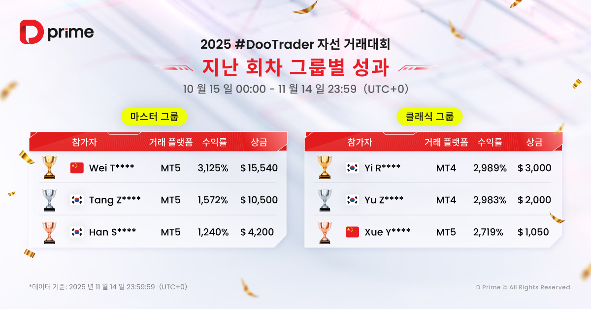 최근 종료된 2025 #DooTrader 자선 트레이딩 4라운드 월간 대회에서 전 세계 우수 트레이더들이 다시 한번 눈부신 활약을 펼쳤습니다.