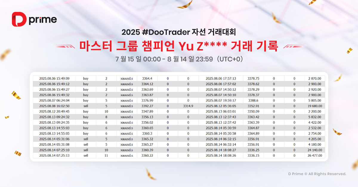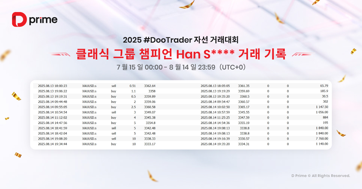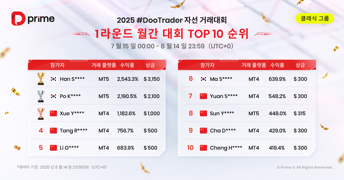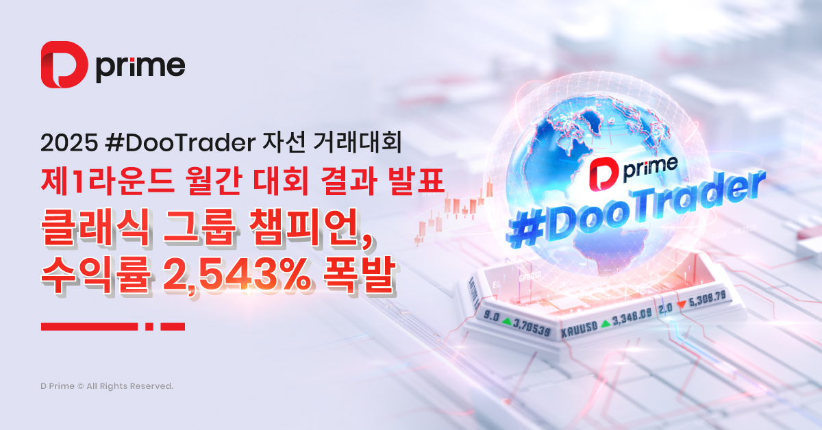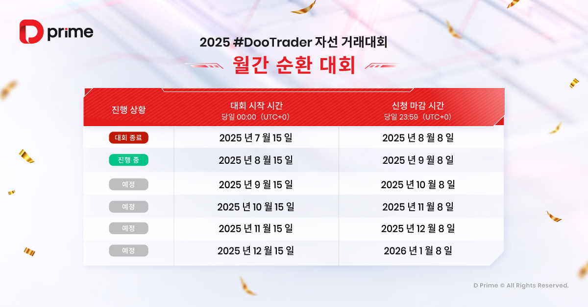 또한 2025 #DooTrader 자선 트레이딩 대회는 사회적 가치를 이어갑니다. 대회에서 1랏 거래가 체결될 때마다 D Prime이 참가자를 대신해 0.1달러를 기부하여 빈곤 아동들의 교육 환경 개선을 지원합니다. 즉, 여러분의 모든 거래는 수익을 넘어 따뜻한 나눔으로 이어져 더 많은 아이들의 미래를 밝히는 힘이 됩니다.