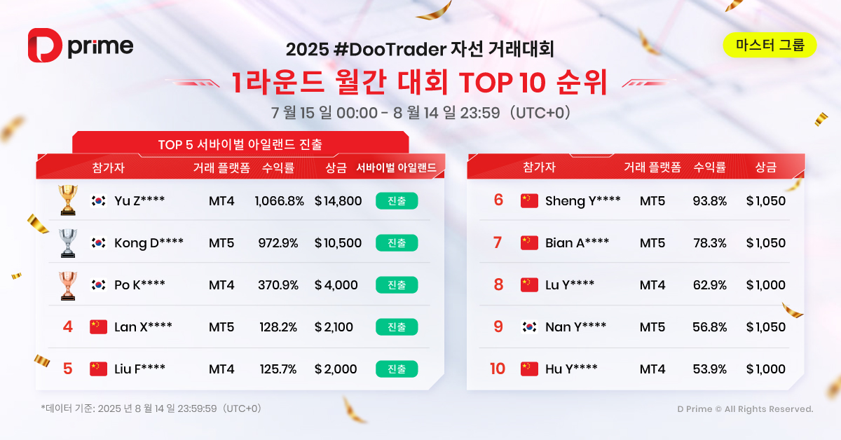 2025년 D Prime #DooTrader 자선 트레이딩 1라운드 월간 대회가 8월 14일 23:59 (UTC+0)에 성황리에 마무리되었으며 1라운드 순위표가 공개되었습니다! 2라운드 월간 대회는 곧바로 이어져, 2025년 8월 15일 00:00 (UTC+0)에 개막했습니다.지금 바로 참가 신청하고 결승 진출권을 향한 치열한 경쟁에 도전해보세요!