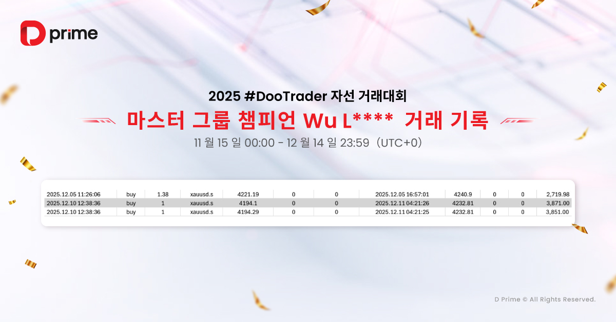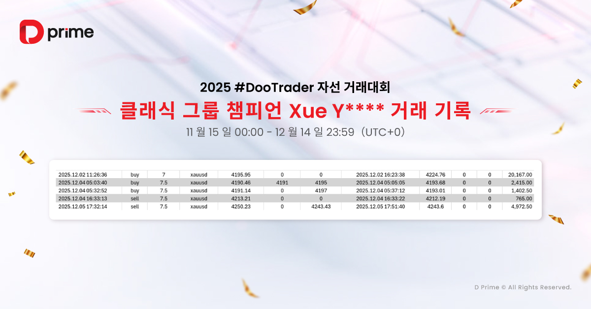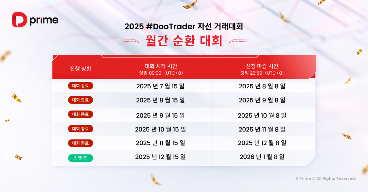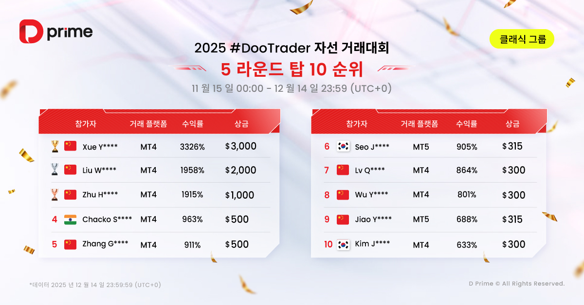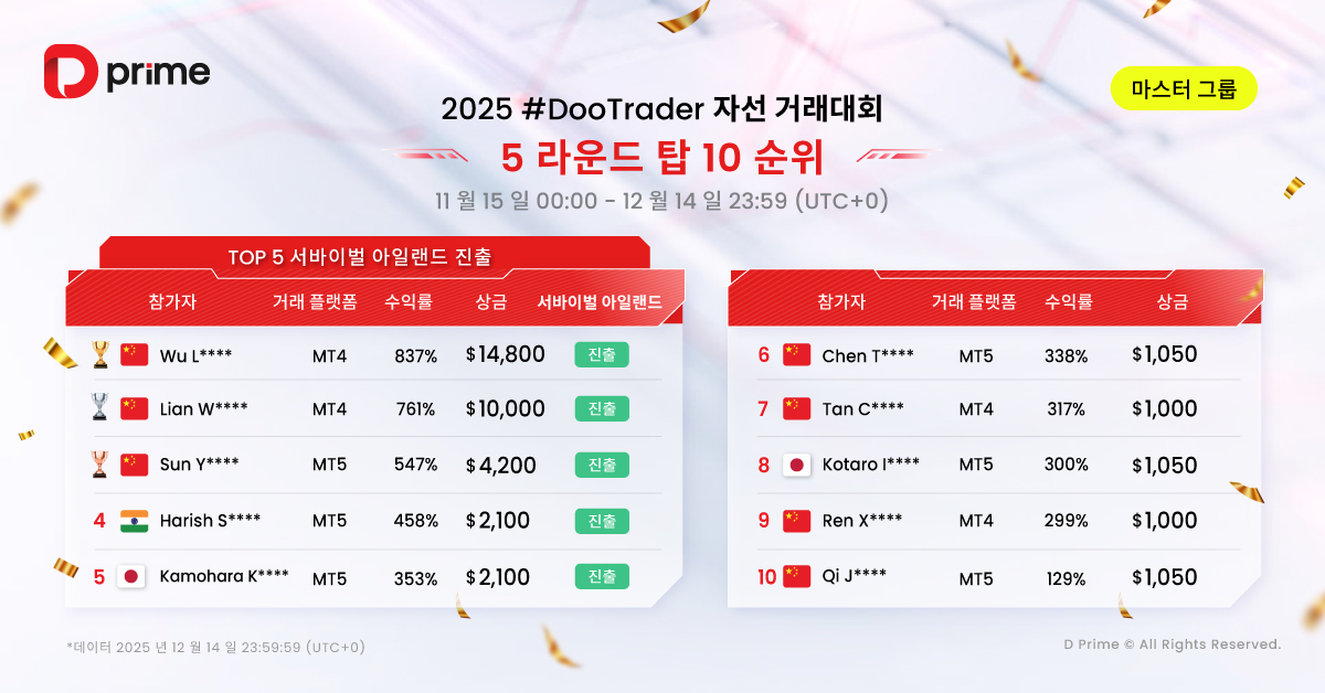 2025년 D Prime #DooTrader 자선 트레이딩 제5라운드 월간 대회가 12월 14일 23:59(UTC+0) 기준으로 성공적으로 마무리되었으며 뜨거운 관심 속에 대회 결과 랭킹이 공식 발표되었습니다!