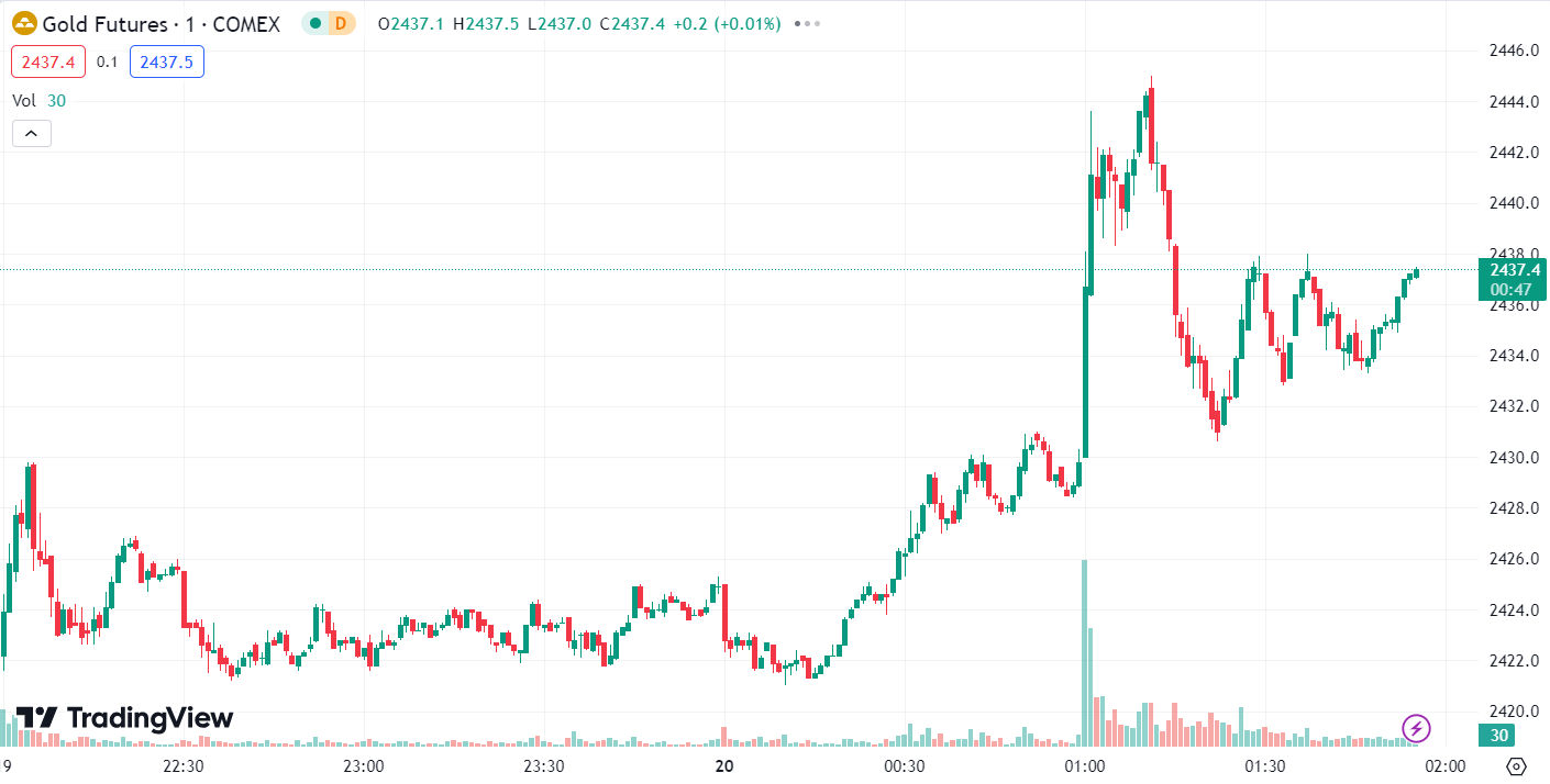 Spot gold experienced high volatility, hitting a more than one-month high of USD 2,425.17 per ounce before closing up 1.58% at USD 2,414.50 per ounce.
