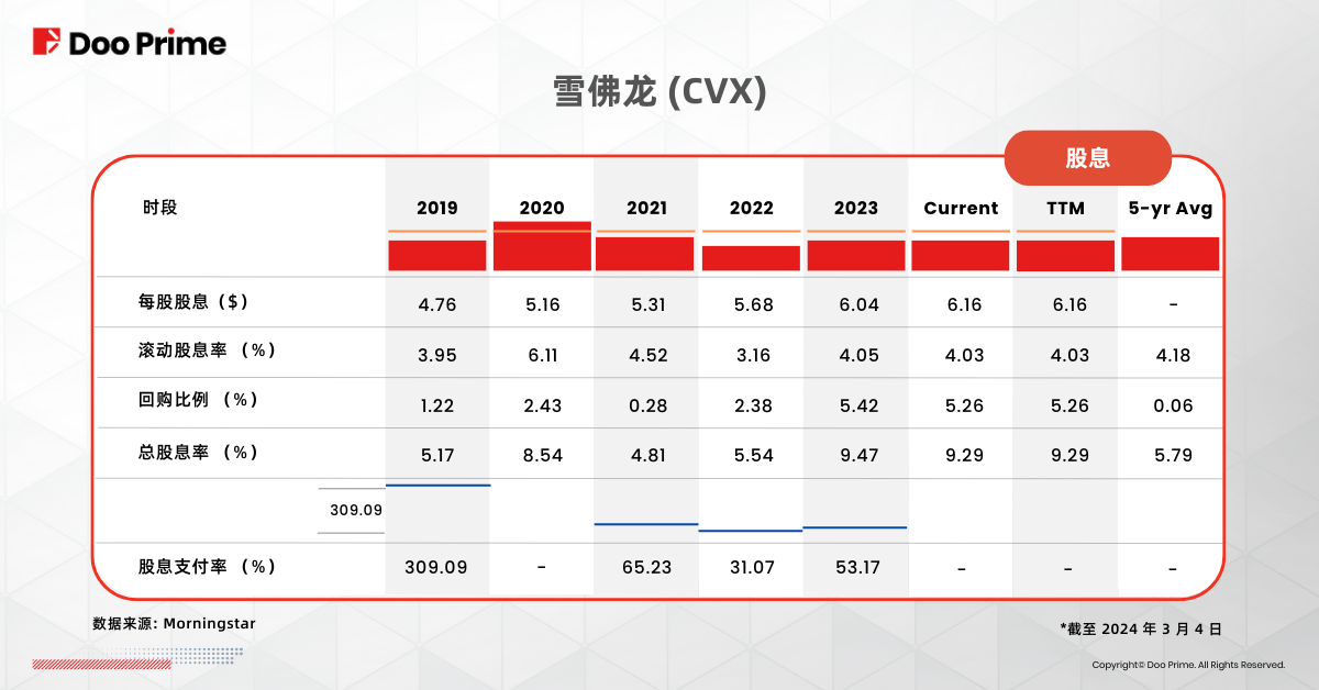 雪佛龙的财务实力体现在其丰厚的股东回报上。2023 年,他们向股东分派创纪录的 260 亿美元,其中 113 亿美元为现金股息,149 亿美元用于股票回购。与 2022 年相比,其回购幅度增长了 32%,每股股息增加了 6%,现金股息支付增加了 3%,表明雪佛龙重视对股东价值的回报。