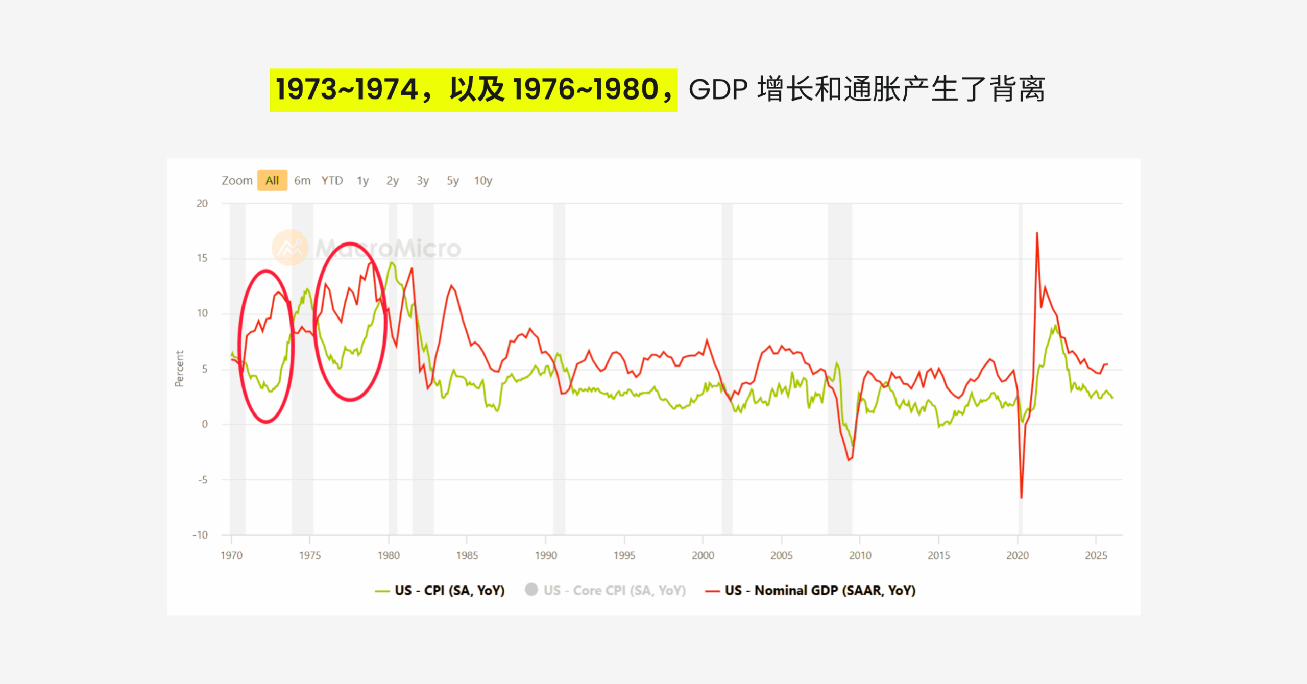 通常来说,GDP 和 CPI 是同步的,经济过热,就会产生通货膨胀,然而在 1973 ~ 1974 年,以及 1976 ~ 1980 年间,美国均出现过 GDP 和 CPI 的显著背离,这是滞胀的真实表现。