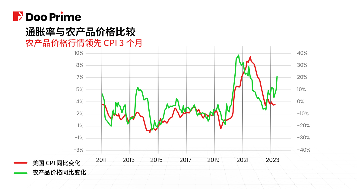 农产品价格从 2024 年初至今已上涨了 21%。从历史上看,它的行情通常领先消费者物价指数(CPI)3 个月。