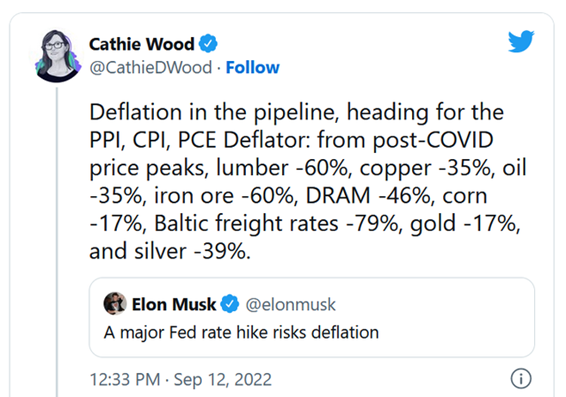 马斯克同样对美国经济非常悲观,当地时间 9 月 14 日,全球首富马斯克点赞伍德的观点,并在推特表示,美联储应该“降息 0.25%”,美联储激进加息将导致美国经济陷入通缩。