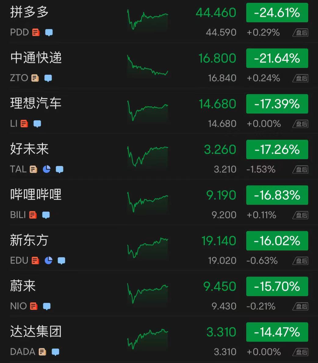 热门中概股集体大跌,拼多多、阿里巴巴、百度、京东、携程、哔哩哔哩跌幅超 10%,其中拼多多、阿里巴巴和京东盘中创历史最大跌幅。阿里巴巴大跌逾 12% 至 63.15 美元,跌破其 2014 年在美发行价 68 美元;京东股价收盘大跌 13.02%,盘中一度跌逾 22%;拼多多股价大跌 24.61%,盘中一度跌逾 35%。其他下跌的中概股包括:
