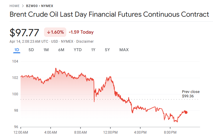 近日因美国对伊朗港口实施封锁,可能进一步收紧全球原油供应,导致国际油价出现上涨。布伦特原油上涨 4.4%,收于每桶 99.36 美元;5 月交割的 WTI 原油上涨 2.6%,收于每桶 99.08 美元。