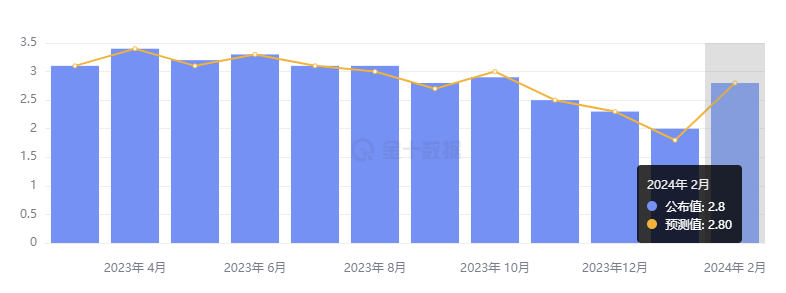 剔除生鲜食品的核心 CPI 同比上涨 2.8%,远高于 1 月的 2%,与预期一致。剔除生鲜食品及能源的核心 CPI 同比上涨 3.2%,低于前值 3.5%,也低于预期的 3.3%,连续 15 个月增速超过 3%。
