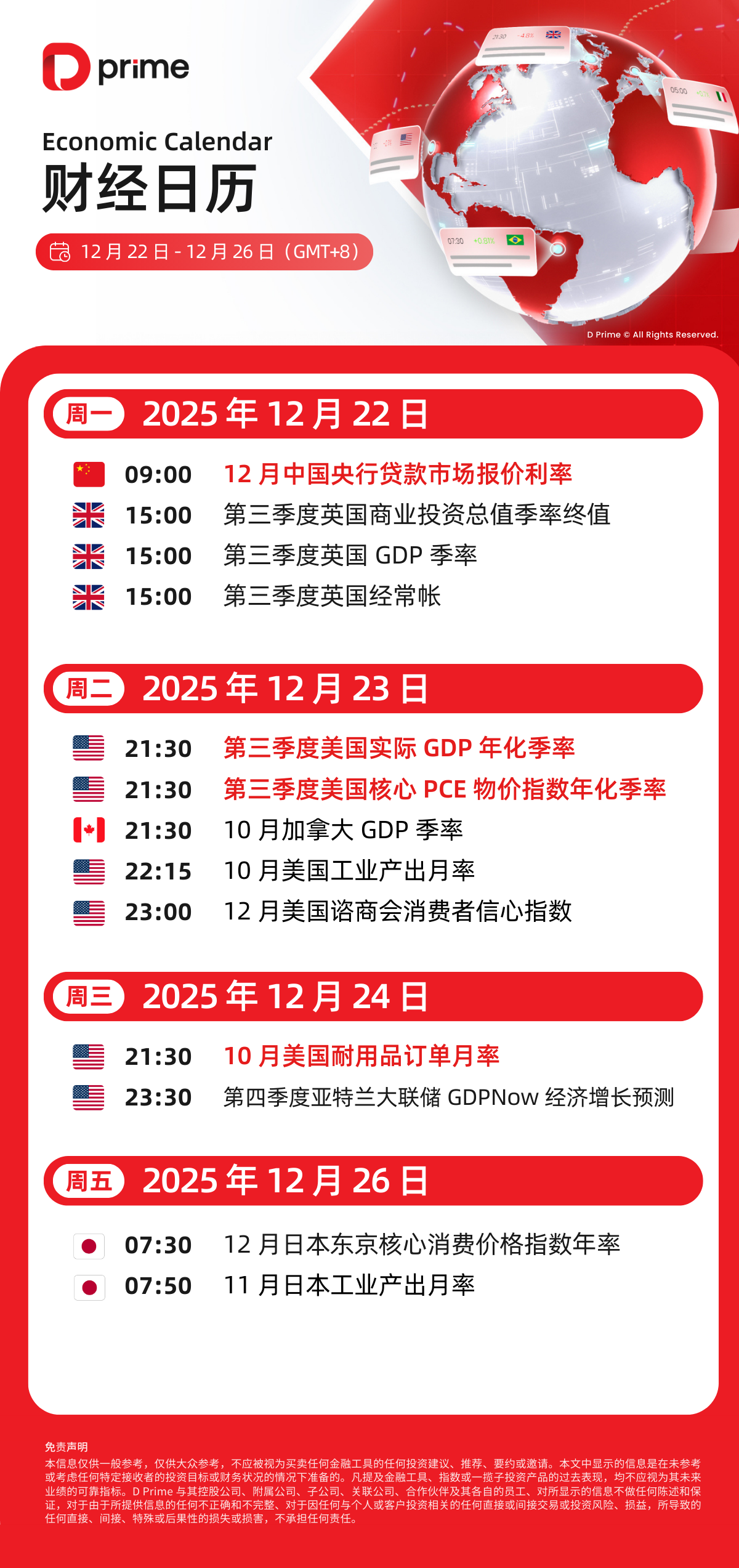 财经日历 | 以下为 2025 年 12 月 22 日至 2025 年 12 月 26 日(GMT+8 北京时间) 全球重大经济事件提醒。在重大行情期间,请确保您已审查您的保证金率,并有足够的保证金来支撑您的风险敞口。
