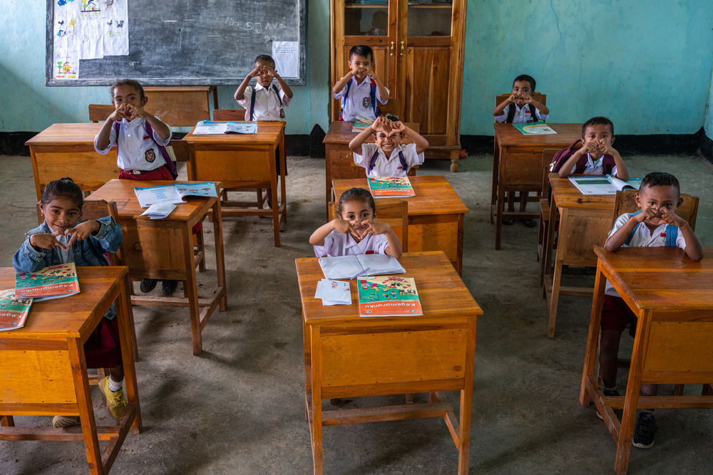 图努阿小学一年级学生在教室里学习,定制的方案侧重于增加获得优质教育的机会,提供清洁水、卫生设施和个人卫生服务,以及基本的健康和儿童保护服务。