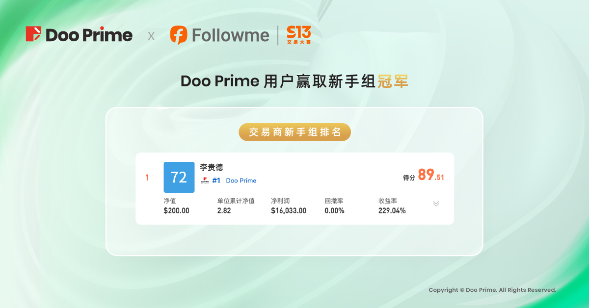 @李贵德 在钻石赞助商 Doo Prime 平台新创建账户,实现 16,033 美元净利润,以 89.51 的得分超越其他众多好手,荣获 FOLLOWME S13 交易大赛新手榜冠军。