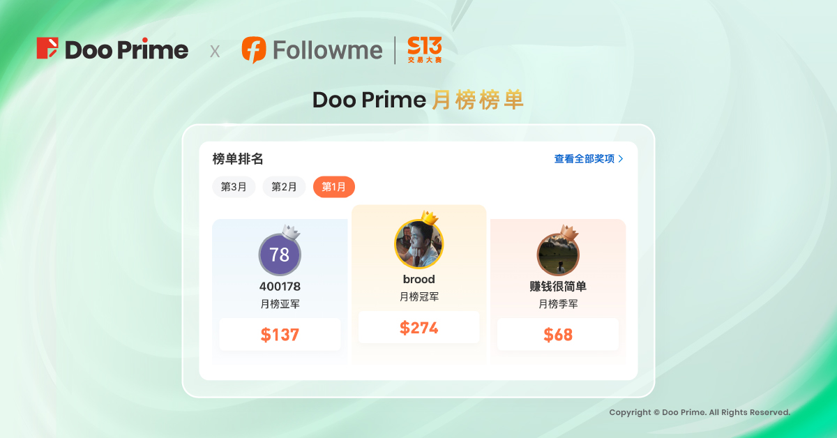 尽管 S13 交易大赛已正式落下帷幕,但投资者的交易新征程才正要启航。未来,Doo Prime 将一如既往,致力于为全球客户提供灵活高效的交易服务,助力投资者在交易大赛中再创巅峰!Doo Prime 还将携手 Followme 一同为广大交易员提供更多活动福利和奖励,敬请留守 Doo Prime 动态!