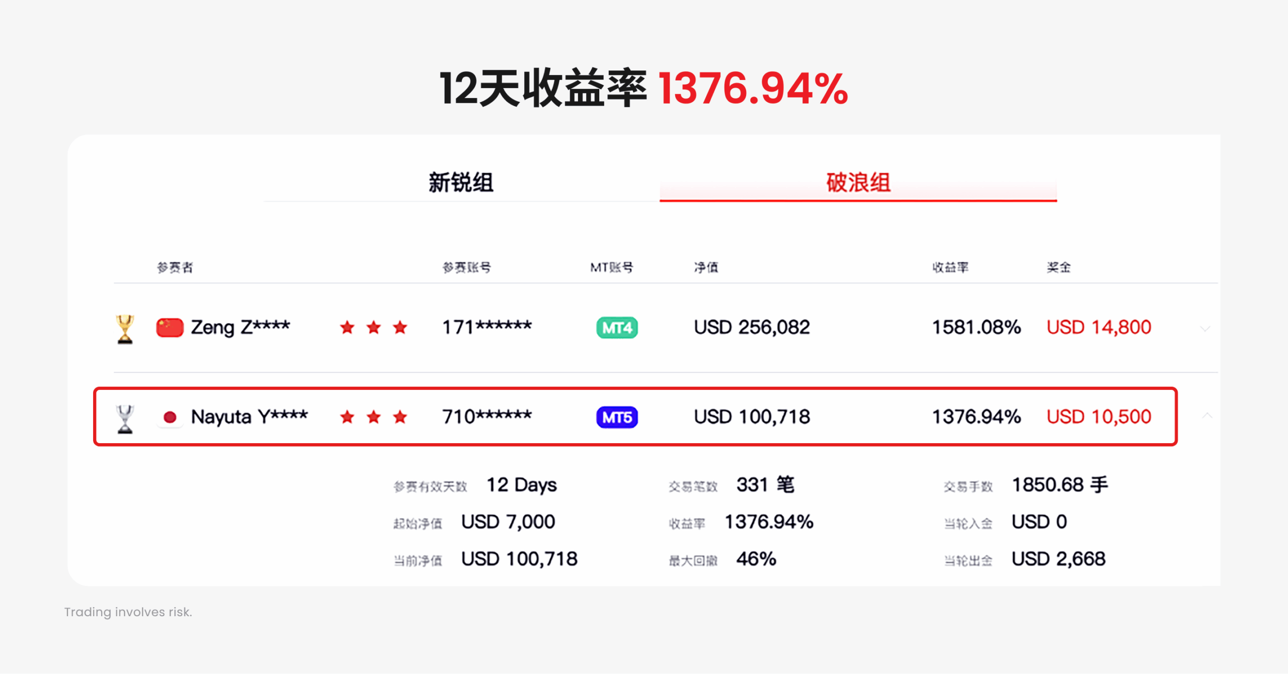 但却有那么一些“非主流”交易员,他们专门在震荡市中进进出出,别人恐惧他贪婪,从而赚到了惊人的收益。来自日本的 Nayuta Yokoyama(横山なゆた),在 12 天中狂揽 1376.94% 的收益率,在第二轮月赛中斩获破浪组第二名的佳绩。