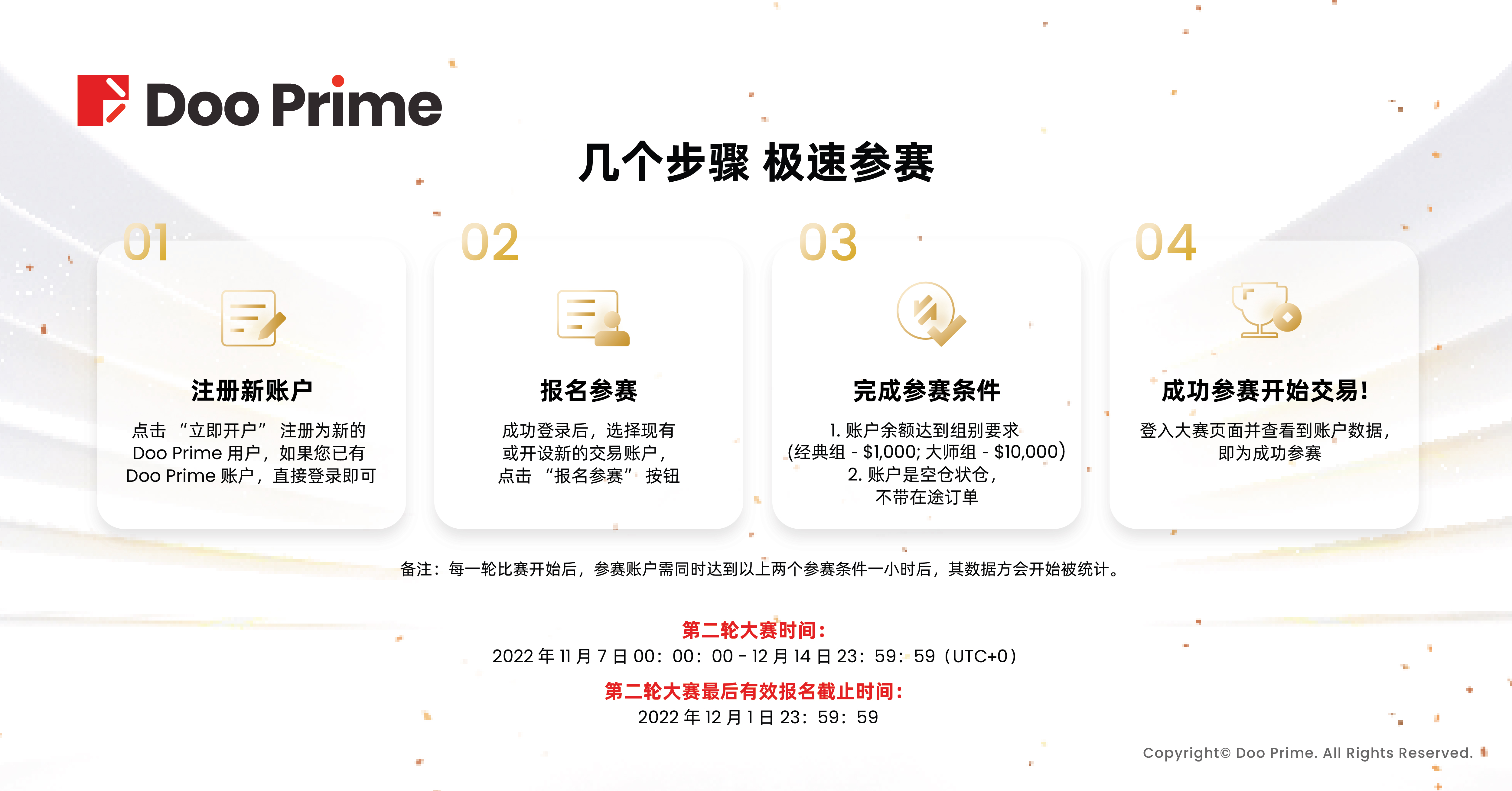 第二轮比赛即将开始,周期为 2022 年 11 月 7 日 00:00:00 至 2022 年 12 月 14 日 23:59:59 。无论你是第一轮赛事回归的二战选手,还是想要摘得桂冠夺取丰厚奖金的新晋选手,我们都期待您的加入,在此提醒各位选手,第二轮比赛报名截止日期为 2022 年 12 月 1 日 23:59:59,期待与您顶峰相见,机会不可错过。