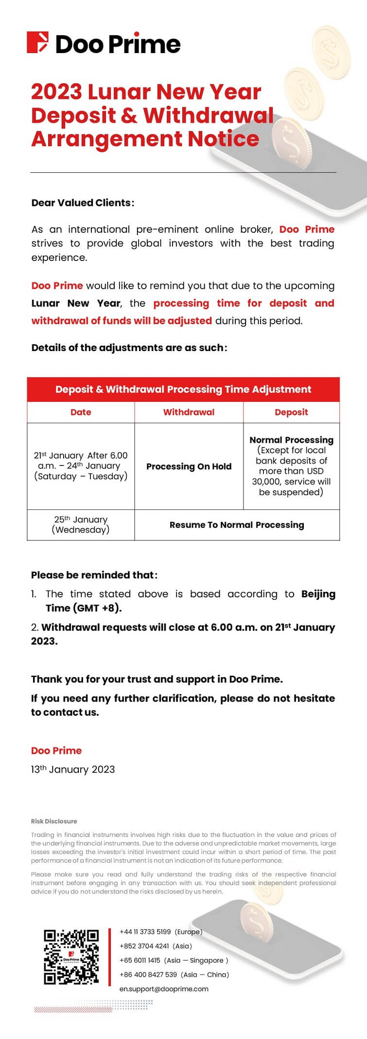 Doo Prime 2023 Lunar New Year Deposit & Withdrawal Arrangement Notice