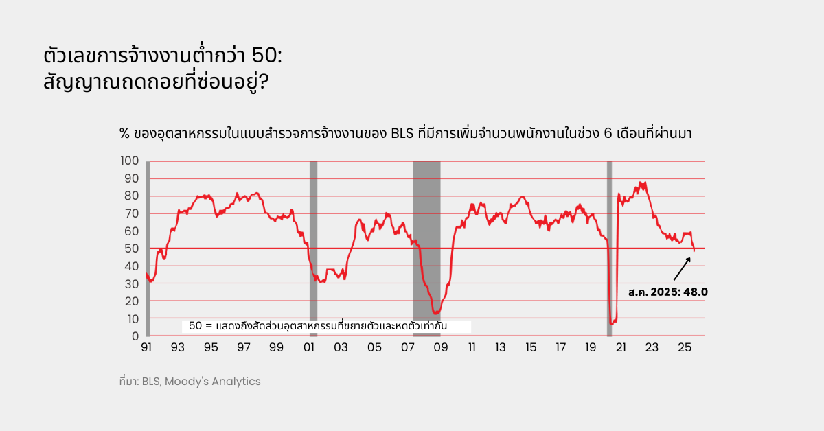 ข้อมูลการจ้างงานล่าสุดจาก BLS ระบุว่า มีเพียง 48% ของอุตสาหกรรมที่เพิ่มตำแหน่งงานในช่วงหกเดือนที่ผ่านมา ซึ่งถือเป็นระดับต่ำที่สุดนับตั้งแต่ช่วงโควิด-19 นี่เป็นสัญญาณที่สำคัญ เพราะตามสถิติแล้ว เมื่อการเติบโตของการจ้างงานต่ำกว่า 50% มักหมายถึงเศรษฐกิจกำลังเข้าสู่ภาวะถดถอย หรือใกล้จะเข้าสู่ภาวะถดถอยในไม่ช้า