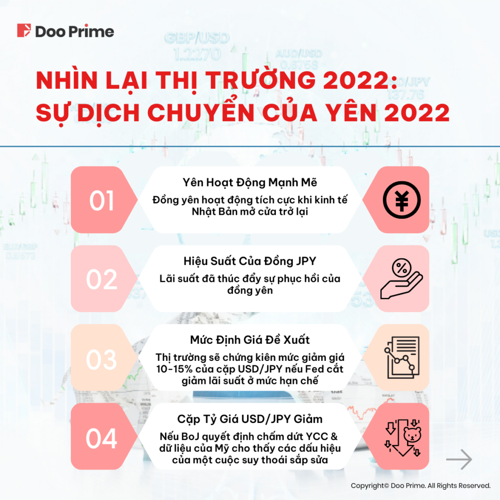 Đồng yên Nhật là một loại tiền tệ nổi bật khác trong năm 2022. Sau khi Nhật Bản mở cửa và cho phép nền kinh tế đi vào hoạt động như bình thường thì đồng yên bắt đầu sở hữu những diễn biến khá tích cực. Bên cạnh đó, chính sách tiền tệ hiện tại của Ngân hàng Nhật Bản đang hỗ trợ đến mức tối đa giá trị của đồng yên trên thị trường tiền tệ quốc tế.